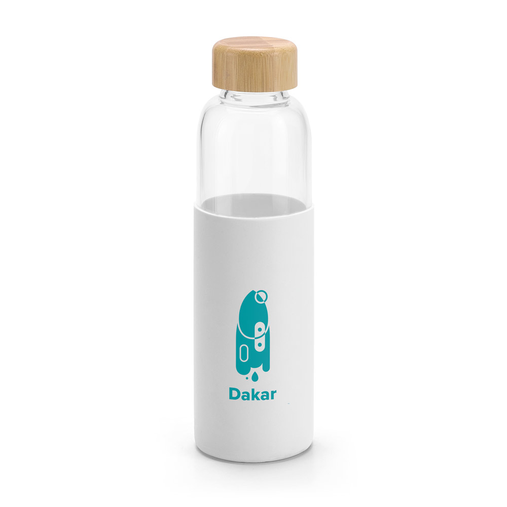 Gourde en verre borosilicaté avec couvercle en bambou et étui en silicone. Capacité jusqu’à 600 mL. Fourni dans une boite cadeau. Le produit étant fabriqué à partir de matériaux naturels, la couleur du produit ainsi que le résultat de l’impression peuvent varier d’un produit à l’autre