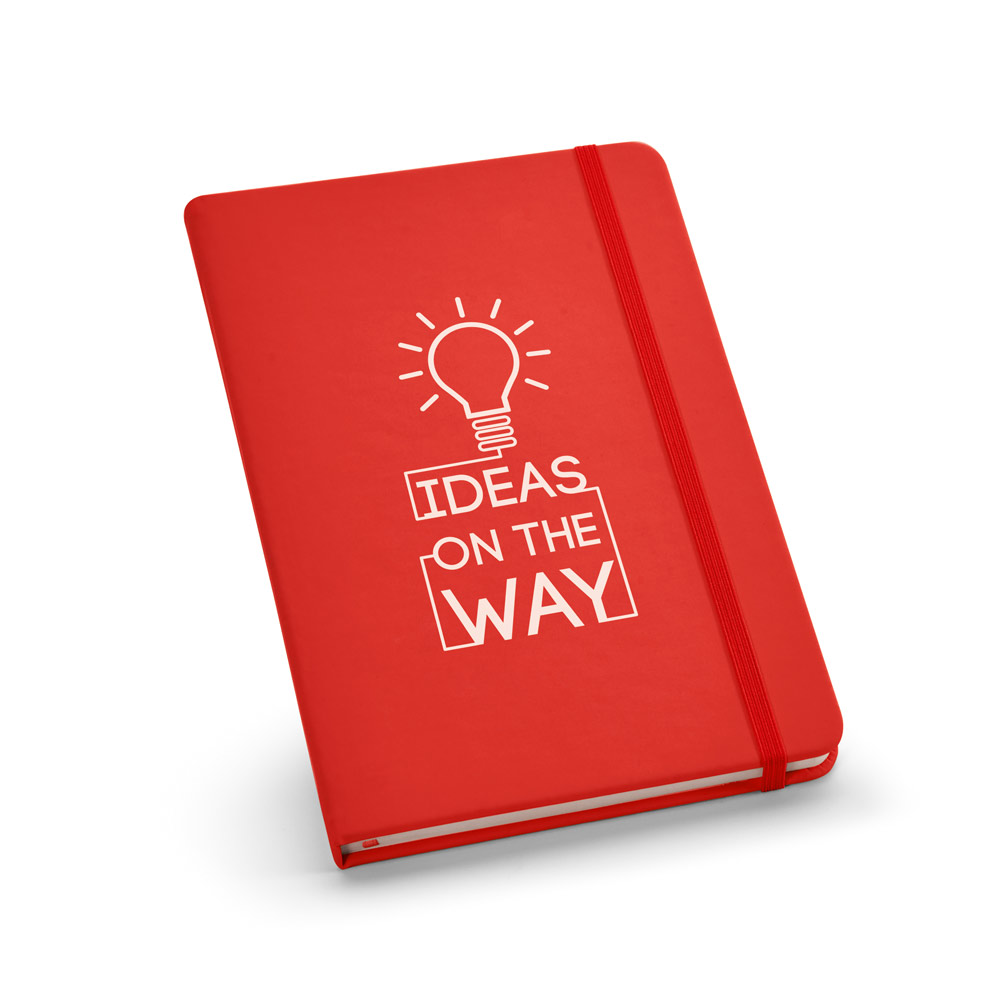 Bloc-notes A5 avec couverture rigide en PU, 160 pages unies (70 g/m²) fabriquées en papier 100 % recyclées, ruban marque-page et élastique. 140 x 210 mm