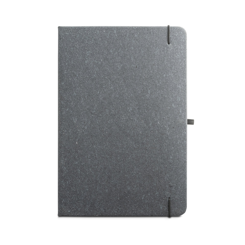 Bloc-notes A5 avec couverture rigide en cuir (70% recyclé) avec 192 pages lignées (70 g/m²), couleur ivoire, fabriquées à partir de matériaux certifiés FSC™ et d’autres matériaux contrôlés. Porte-stylo (non inclus), élastique et ruban séparateur noir. Avec une pochette intérieure. Le produit étant fabriqué à partir de matériaux naturels, la couleur du produit ainsi que le résultat de l’impression peuvent varier d’un produit à l’autre