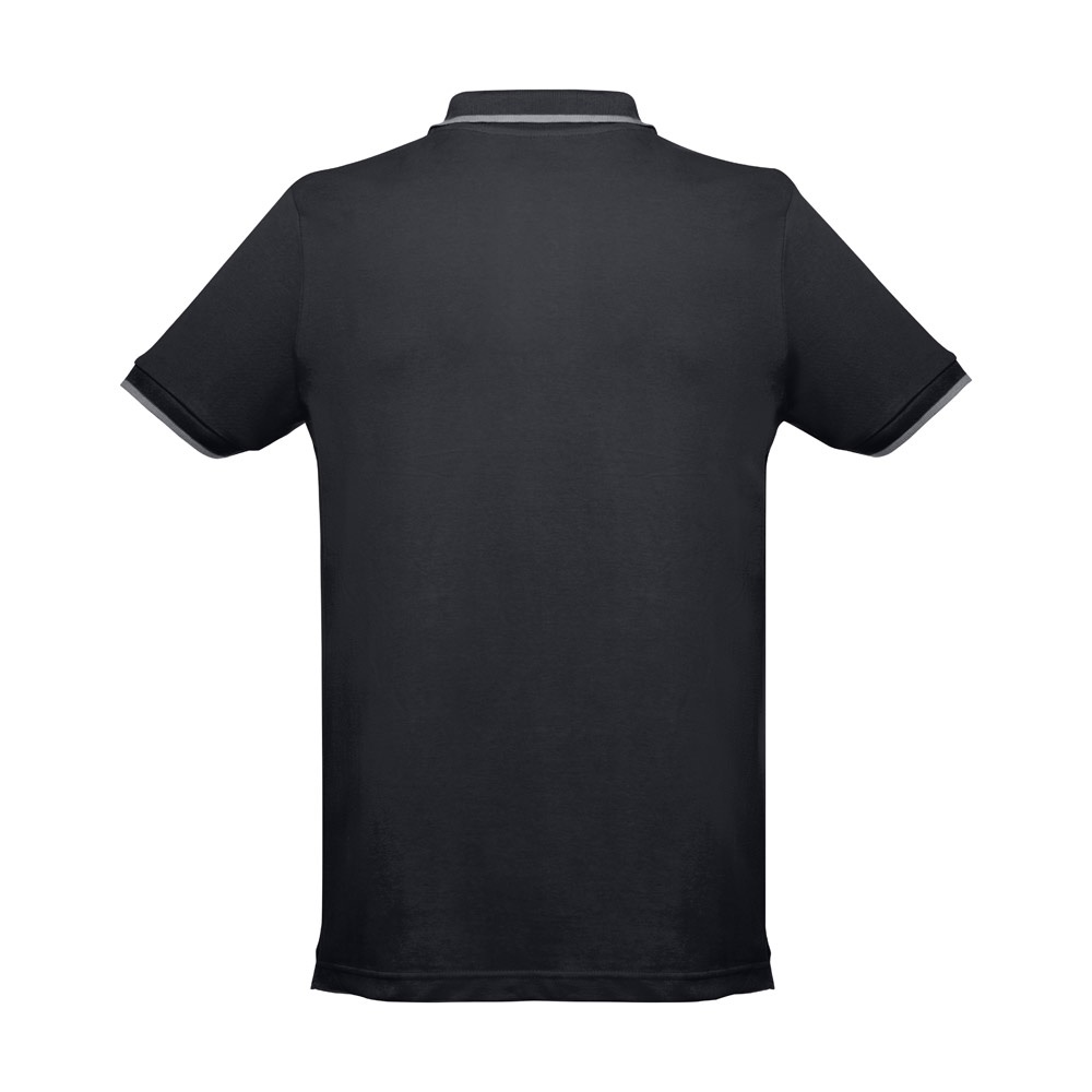 Polo pour homme à manches courtes bicolore en maille piquée 100% coton (210 g/m²) (couleur 183 : 85% coton/15% viscose). Contraste bicolore sur le col, les manches et la patte de boutonnage. Contient un col et des manches côtelés. Patte de boutonnage renforcée avec 3 boutons de couleur contrastée (bouton de remplacement inséré dans la couture intérieure). Pièce slim fit avec de petites ouvertures latérales au bas