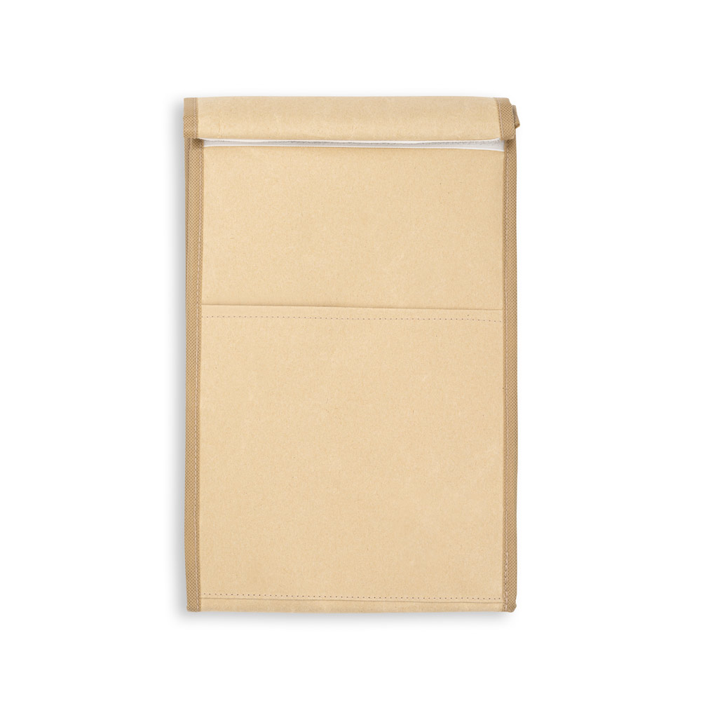 Sac isotherme en papier avec fermeture adhésive, qui permet de conserver les aliments au frais et bien rangés. Son design unique facilite son transport et son rangement.Matériau extérieur: papier, avec renfort intérieur en non-tisséIsolation thermique: film aluminiumCapacité (L): 4Compartiments: 1 compartiment principal rembourréPoches extérieures: 1 poche avantDimensions : Fermée: 195 x 350 x 110 mm | Ouvert: 195 x 410 x 110 mm