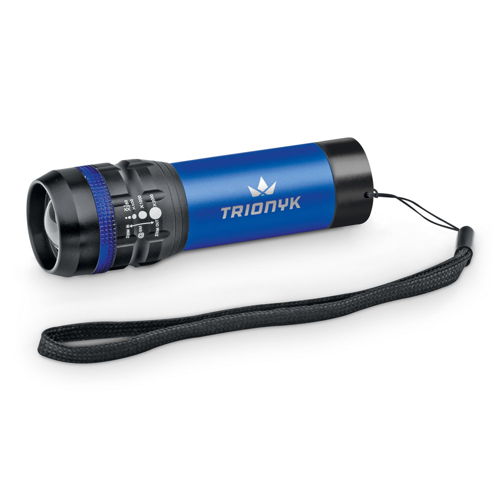 Lampe de poche en aluminium avec fonction zoom avec 3 modes d’éclairage, lampe LED 1 W (60 lumens) et poignée. Inclus 3 piles AAA. Livré dans un coffret cadeau